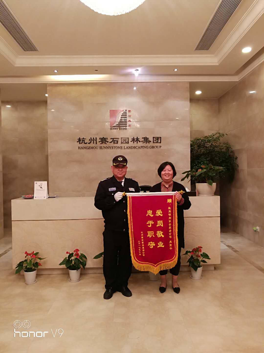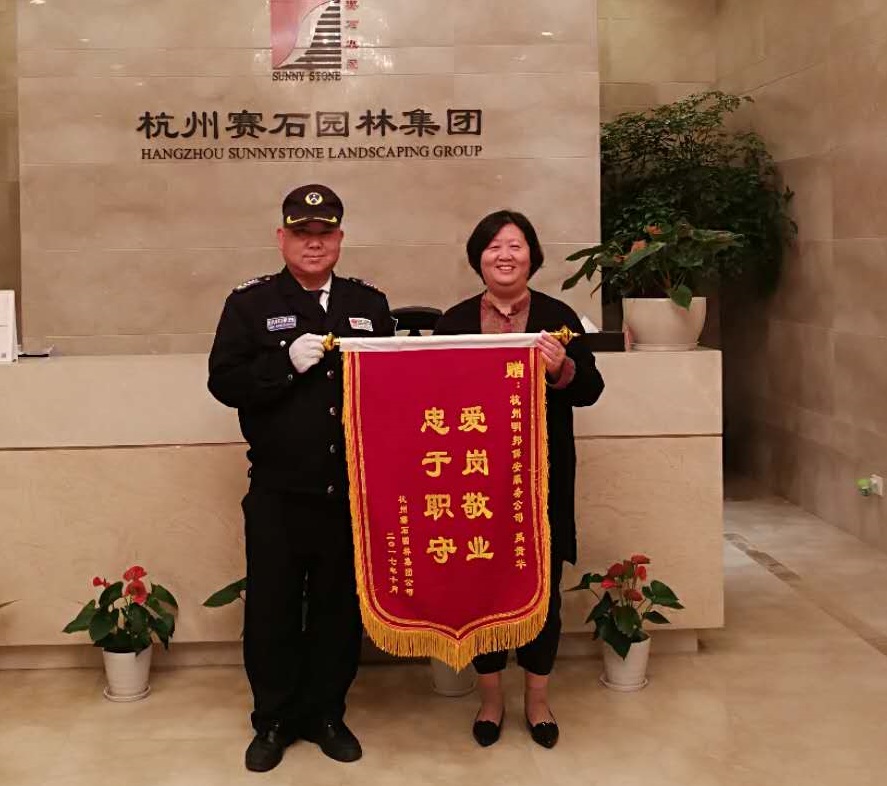 杭州赛石园林集团驻点保安领班禹贵华同志,于2014年3月调至该驻点,几年来工作一直任劳任怨,尽心尽责,客户单位求的工作都能及时高效的完成,为肯定禹贵华和班组人员的优异工作,集团行政部张主任代表公司给派驻执勤点的保安员送锦旗一面,以示鼓励!并对我们明邦后勤部的全体保安员表示感谢。感谢我们默默的付出,解决了他们后顾之忧!