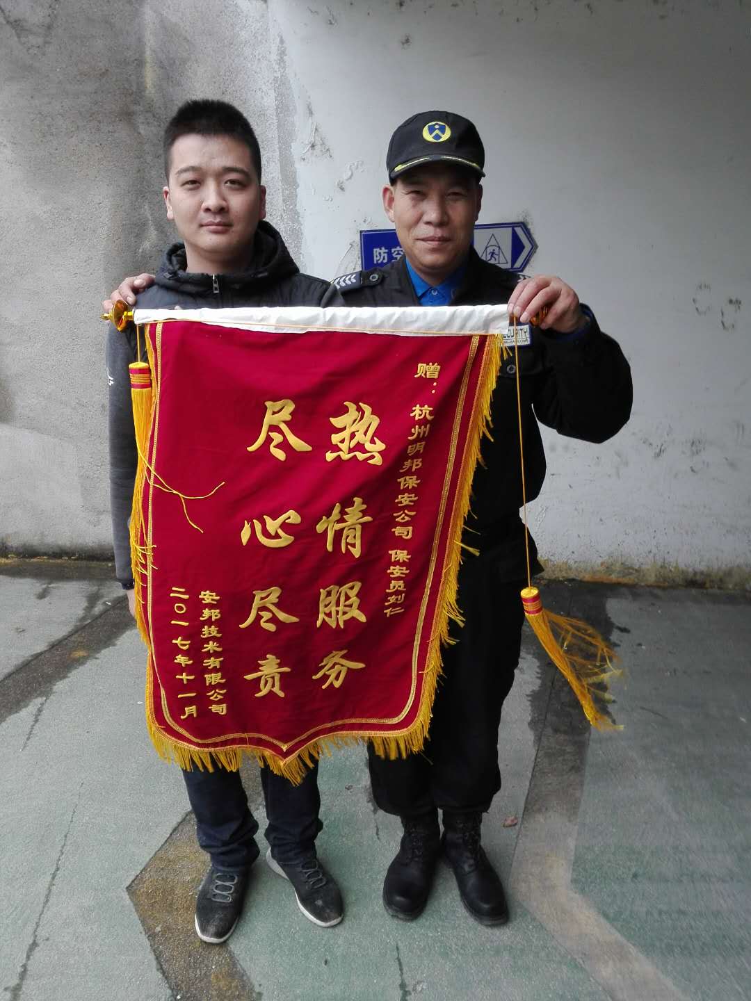 11月30日10点20分,公司驻宝信大厦保安员刘仁在巡逻检查时,看到安邦技术公司员工在施工中头部被钢筋打中,顿时鲜血直流,当时刘仁立即上前帮忙止血,并联系贵公司负责 人,当时负责 人在外面,刘仁按负责人的要求送到滨江区武警医院,刘仁二话没说马上背起伤者到能打到车的地方,做车送到了就近的医院,到医院检查包扎后,贵公司负责人赶到,对我司保安员热心助人的精神表示万分感谢 ,特赠锦旗一面,以示对我公司保安员的认可与感谢 。
