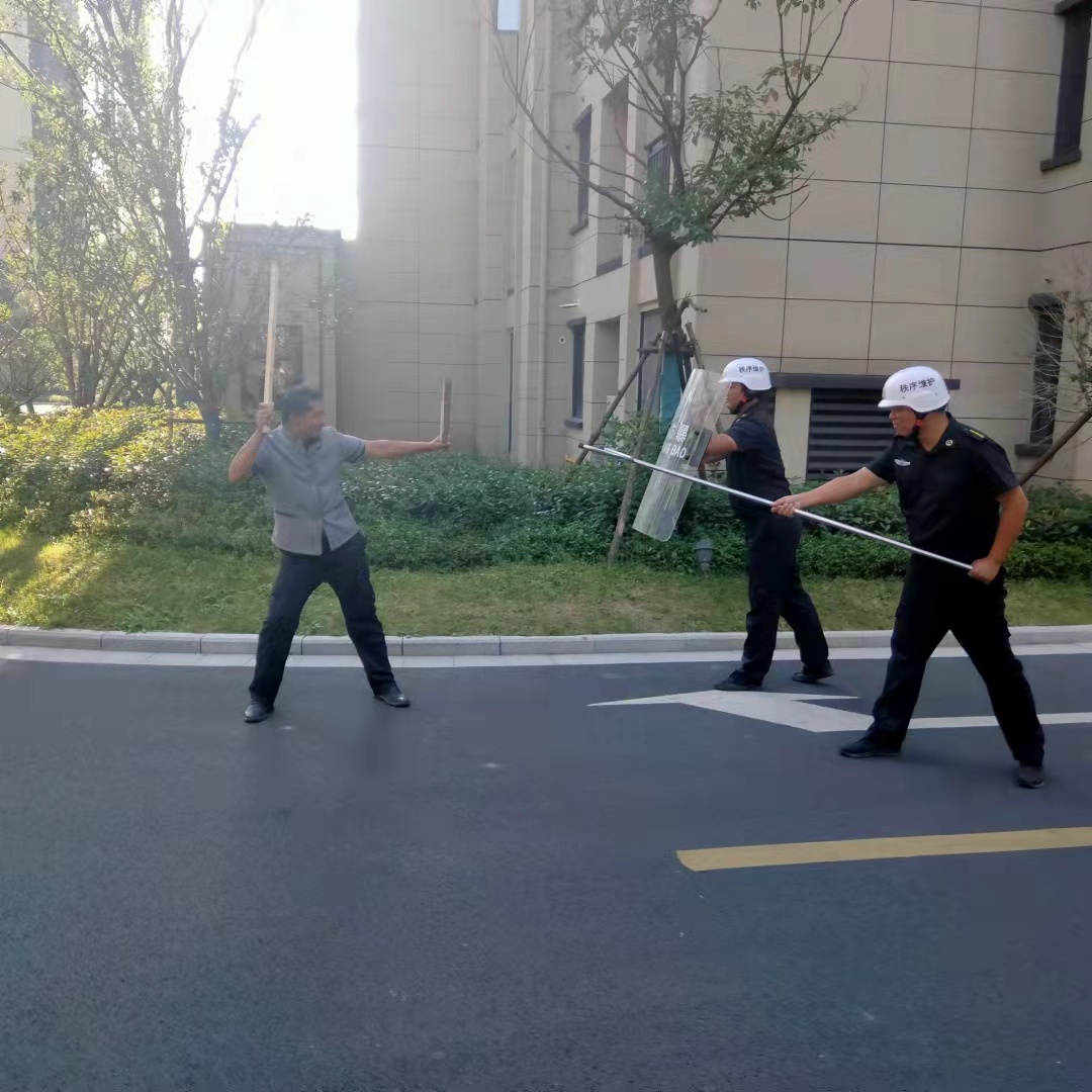 演练模拟“闹事者”冲进小区,手持刀棒并威胁业主,值班队员发现情况后,立即拨打110报警并将情况报告保安队长。在收到警讯后,保安队长迅速启动应急预案,召集防暴小分队装备防暴器械快速赶往事发现场。