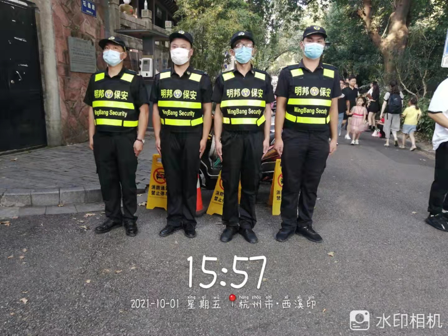 为了保障国庆期间西湖景区安全保卫工作,国庆长假期间明邦保安公司受双基大队委托成立突击组,为期7天公司共派出50人次保安员参与派出所一起的联合执勤,负责西湖景区岳王庙路段及周边治安巡逻和安保工作,参勤队员克服了安保时间长、连续工作强度高等困难,积极疏导旅游景点的游客秩序,耐心引导群众文明旅游,圆满完成了执勤任务。
