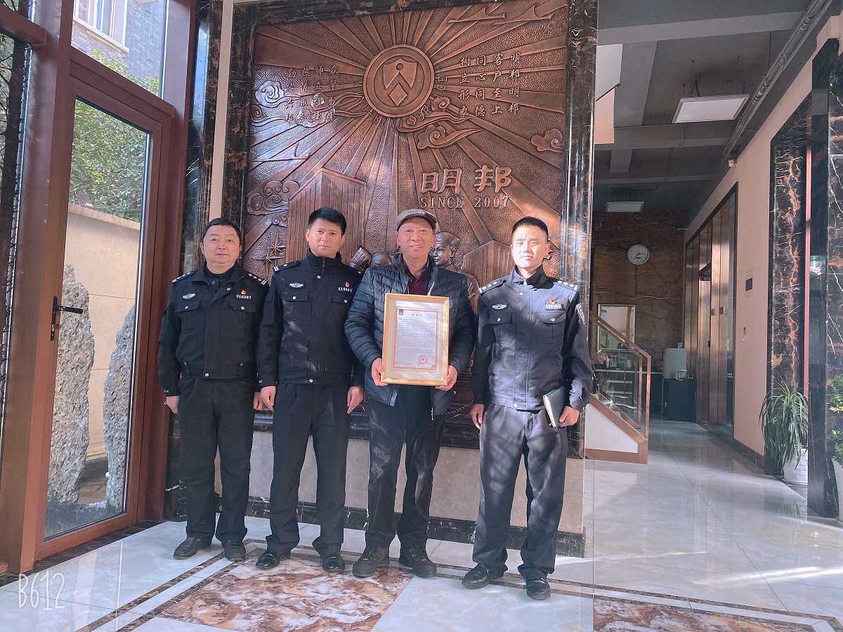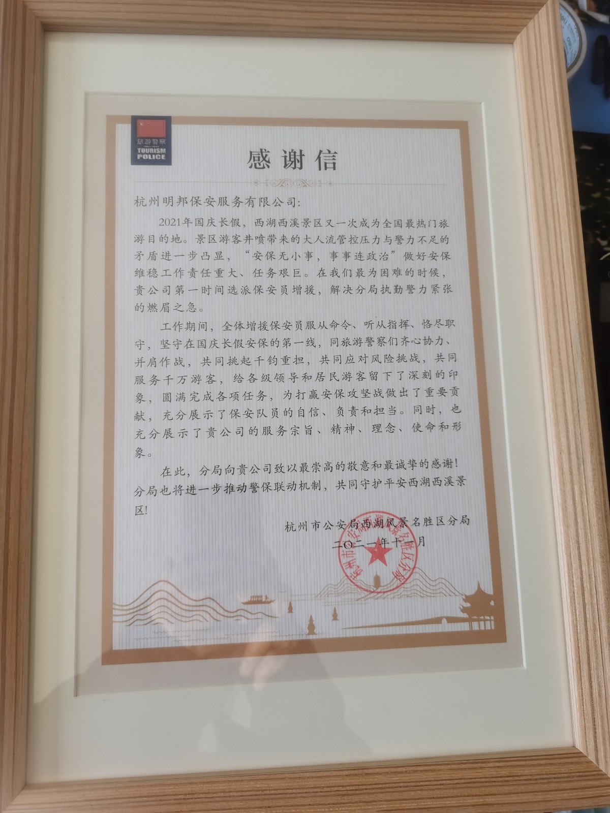 西湖分局负责人表示:在我们最为困难的时候,贵公司第一时间选派保安员增援-----“明邦义警”保安员积极协助公安机关最大限度地消除各类风险隐患,圆满完成了国庆安保工作。解决分局执勤警力紧张的燃眉之急,得到分局的高度赞扬。