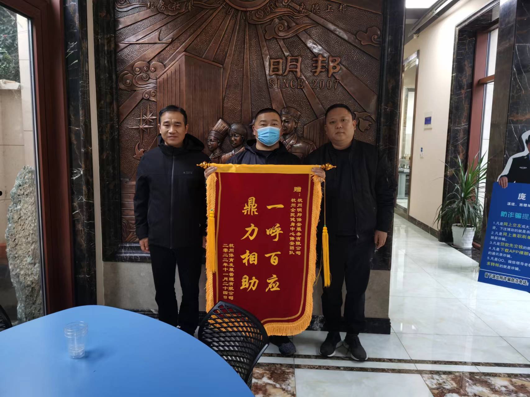 由于出动及时,大家成功的将这起火灾消灭在萌芽之中,保护了全名健身中心的财产安全。明邦保安为保护客户财产安全不怕危险,一呼百应,鼎力相助灭火的英勇行为得到甲方领导的表扬。
