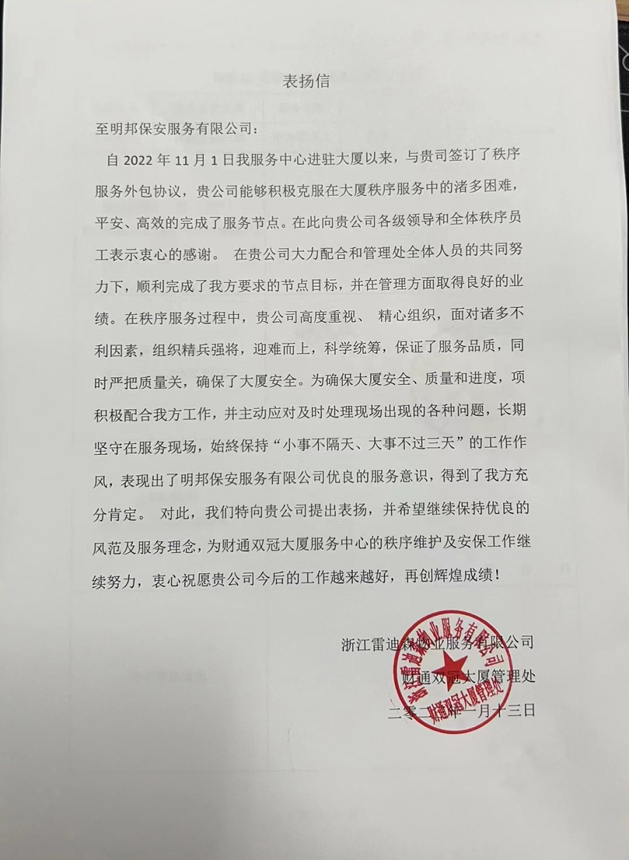 自2022年11月1日我服务中心进驻大厦以来,我司保安队员能够积极克服在大厦秩序服务中的渚多困难,平安、高效的完成了服务节点。在此向我公司各级领导和全体秩序员工表示衷心的感谢。在我公司大力配合和管理处全体人员的共同努力下,顺利完成了甲方要求的节点目标,并在管理方面取得良好的业绩。在秩序服务过程中,我公司高度重视、精心组织,面对诸多不利因素,组织精兵强将,迎难而上,科学统筹,保证了服务品质,同时严把质量关,确保了大厦安全。为确保大厦安全、质量和进度,项积极配合甲方工作,并主动应对及时处理现场出现的各种问题,长期坚守在服务现场,始终保持“小事不隔天、大事不过三天”的工作作风,表现出了明邦保安服务有限公司优良的服务意识,得到了甲方充分肯定。希望我司队员继续保持优良的风范及服务理念,为财通双冠大厦服务中心的秩序维护及安保工作继续努力,愿今后的工作越来越好,再创辉煌成绩!