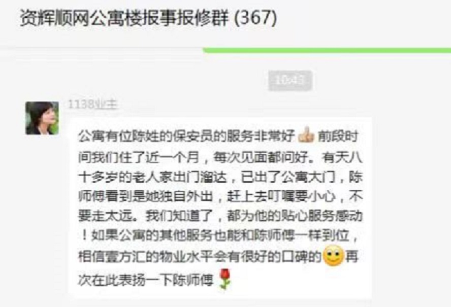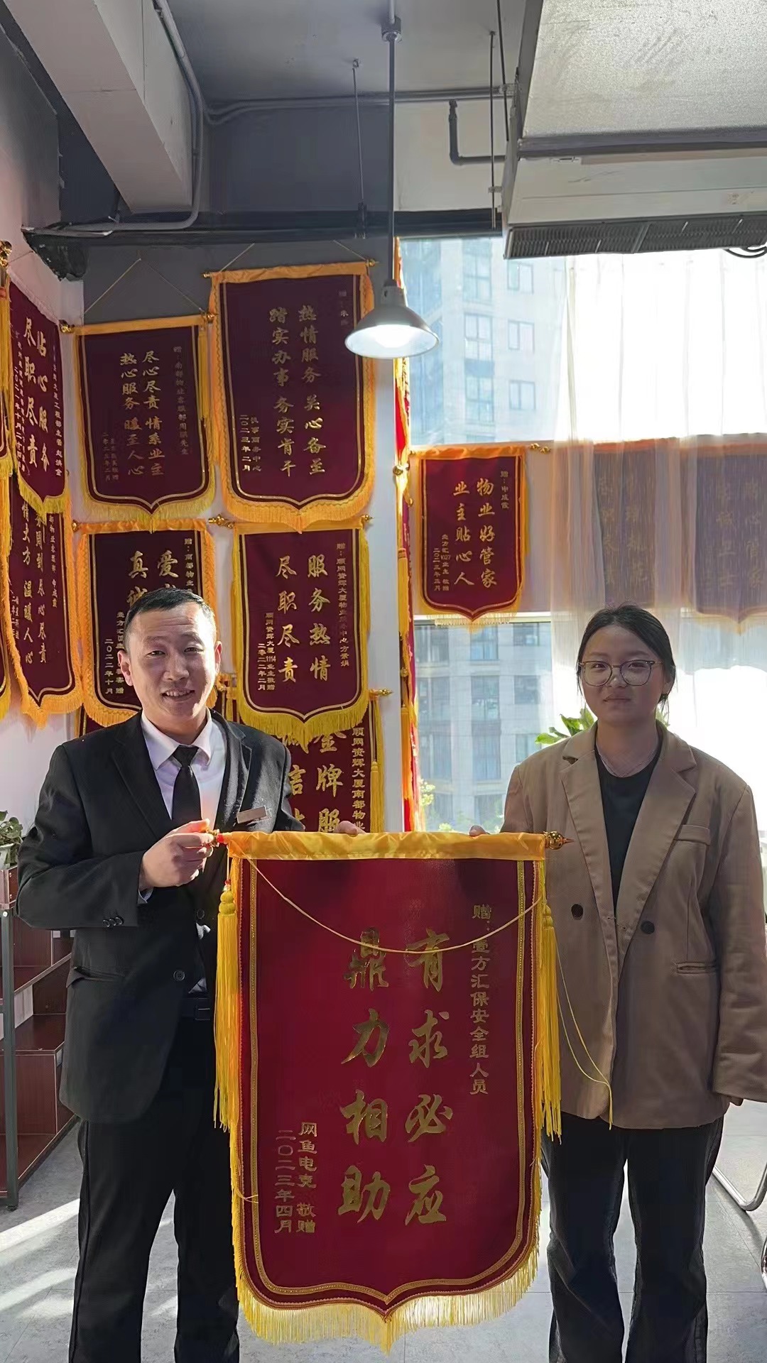 比如今天资辉顺网公寓楼保安队就收到业主的锦旗,对我们保安陈师傅的的服务表示高度的肯定,“有求必应,鼎力相助”这样的赞许送给明邦保安驻壹方汇保安队,尤其对保安陈师傅的贴心服务表示感动! 望公寓的其他服务也能和陈师傅一样到位,相信壹方汇的服务水平会有更好的口碑。