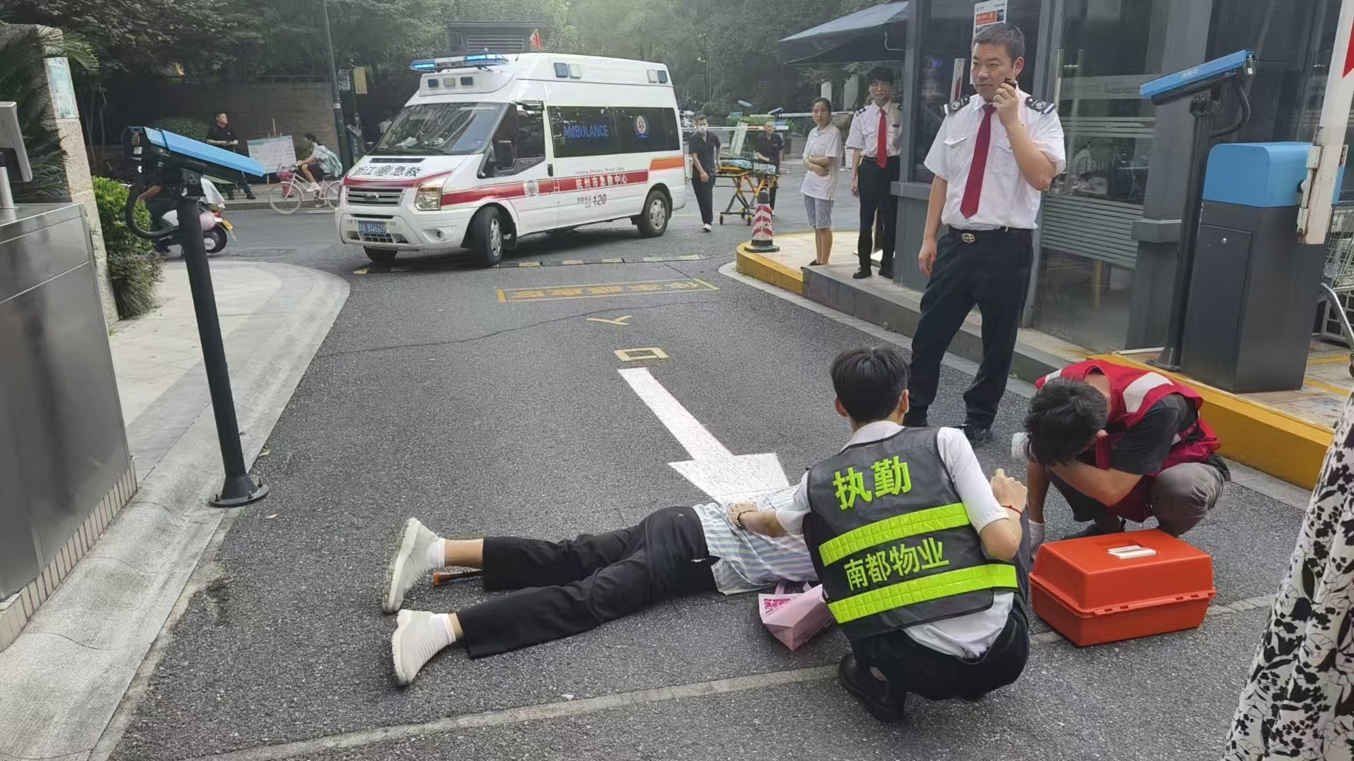 正在执勤的明邦保安队员谷一豪第一时间发现异常,没有丝毫犹豫,立即上前查看。只见老人已神志不清,口中不断有鲜血流出,情形十分紧急。面对突发状况,谷一豪临危不乱,迅速用对讲机呼叫领班支援,并果断拨打了120急救电话,清晰准确地说明现场情况,为抢救争取了宝贵时间。