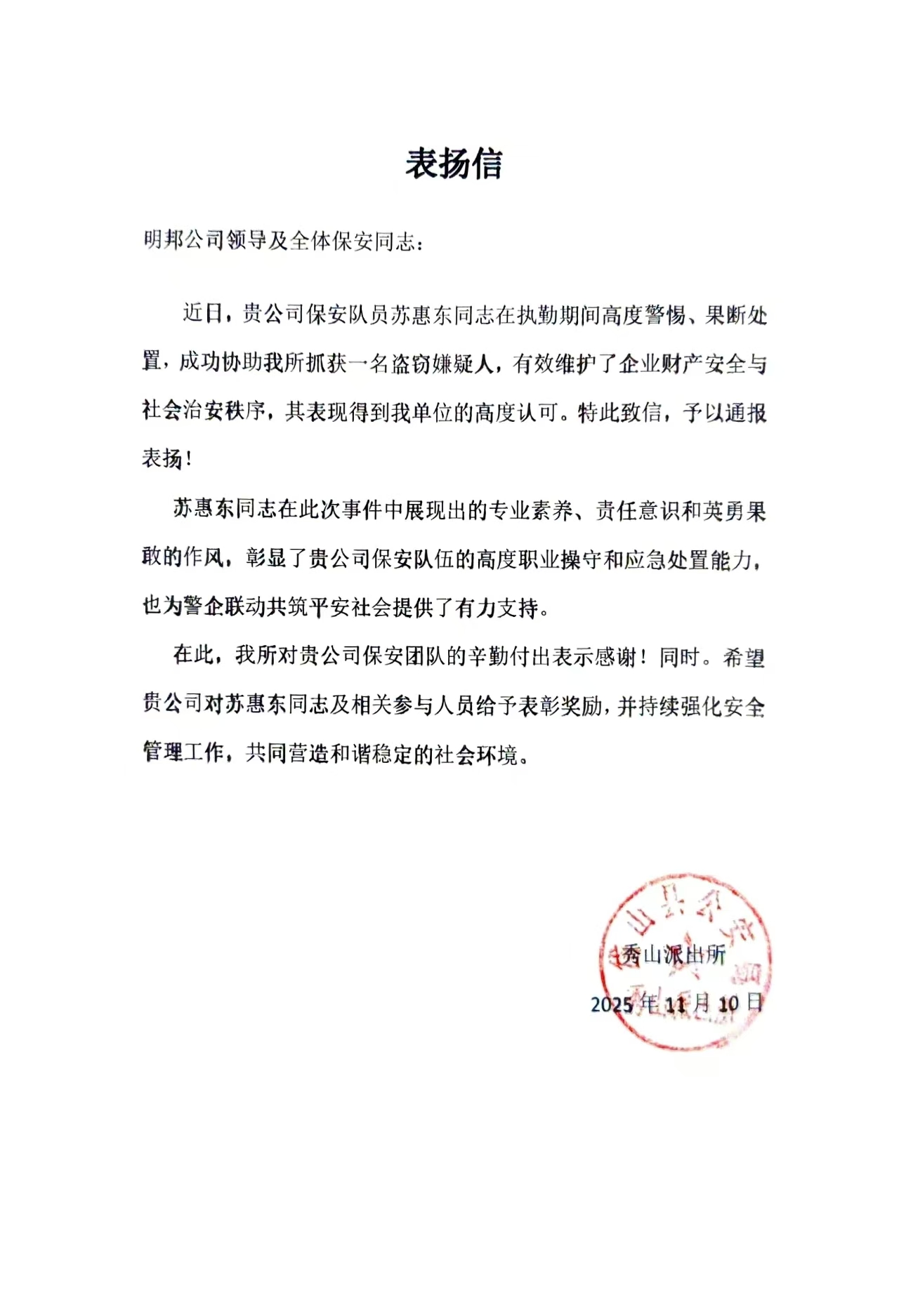 今日,我们收到了秀山派出所发来的表扬信 —— 信中不仅点赞苏惠东 “专业素养过硬、责任意识突出”,更肯定了明邦保安队伍 “应急处置能力强、职业操守高”。