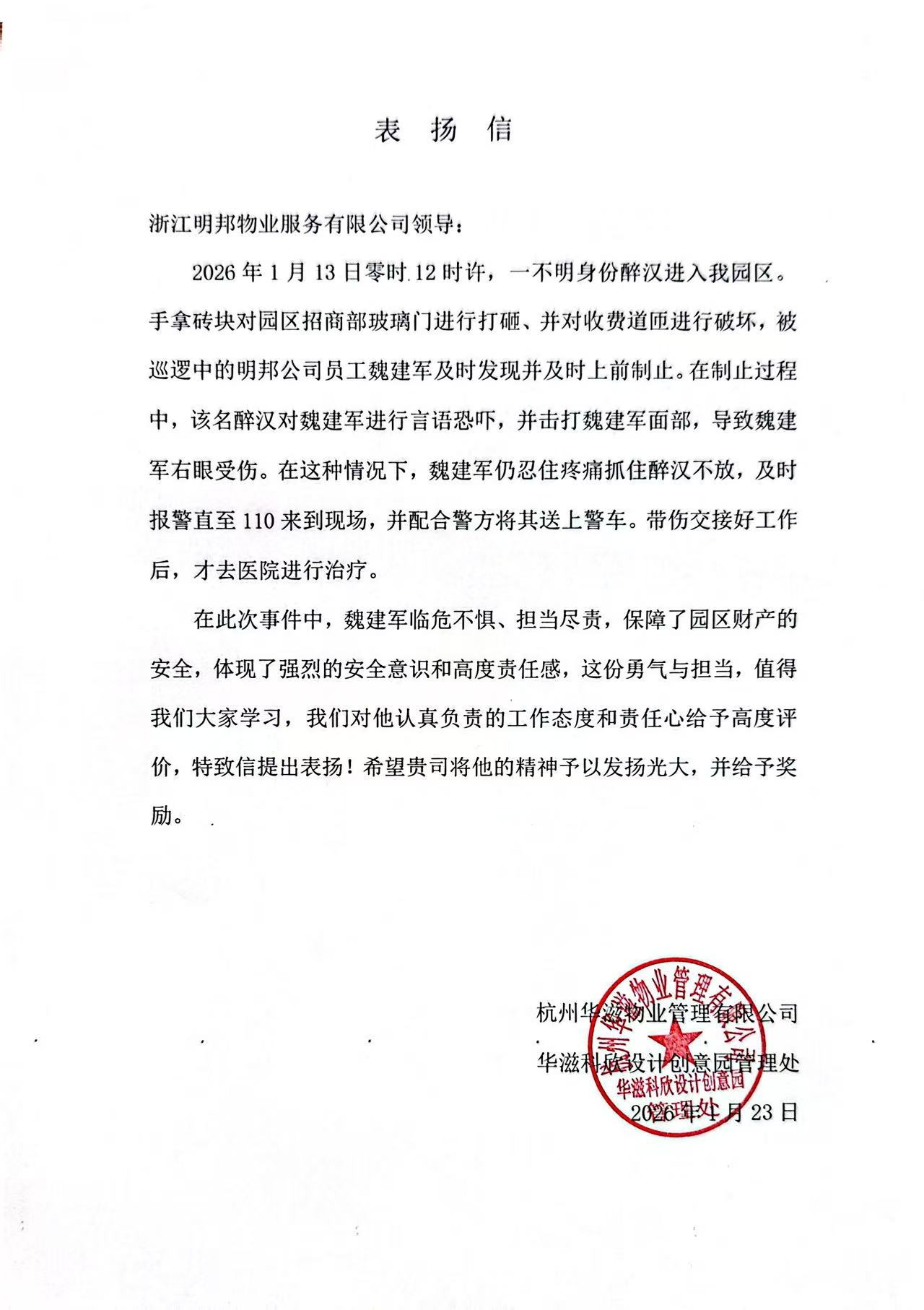 2026 年 1 月 13 日凌晨,一名醉汉闯入园区打砸设施。正在巡逻的魏建军同志第一时间上前制止,面对醉汉的暴力袭击,他右眼受伤仍死死控制住对方,直到协助警方将人带走,交接完工作才去医院治疗。他用血肉之躯守护了园区安全,用行动诠释了 “责任在肩、使命必达” 的职业精神。