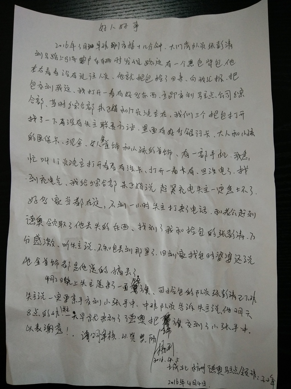 2016 年3月明邦驻杭州德奥门岗早班保安员张彭涛在引导客户车辆时捡到一个黑色背包,当时没有过往人员,在确认无人认领之后,交给了队长王峰,队长把包交给综合管理部主管朱正娟,这时打开包发现里面有数张银行卡,大人和小孩子的医保卡,现金以及大人和小孩子的金首饰,还有手机一部,当时手机是没电的,队长找到充电器,几经周折终于联系到失主李女士,李女士感激万分,表示当时根本不知道包丢到哪里去了正在着急,听到此电话,随后赶来,当时拿出现金给张彭涛被其谢绝,次日一天早,李女士特地送来一面锈“拾金不昧,品德高尚”的锦旗交到保安员张彭涛手中以表谢意。也感谢我明邦保安培育出如此拾金不昧之人。