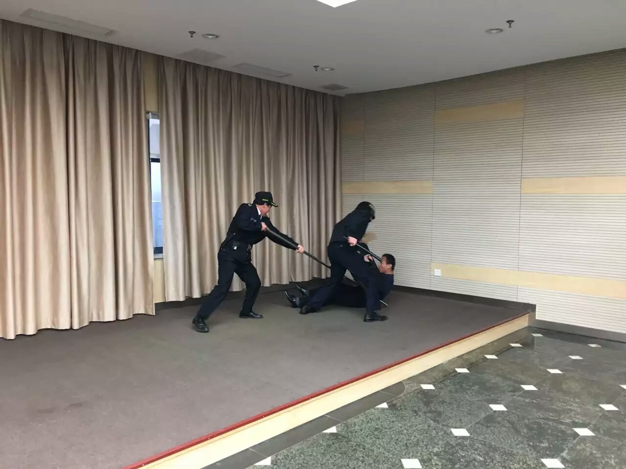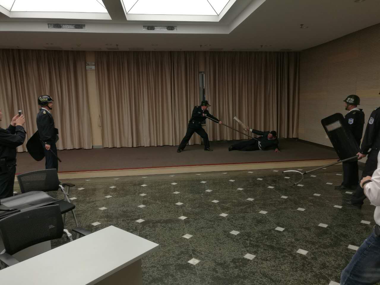 2016年5月20日上午, 明邦保安桐乡驻点开展了防恐处置演练,本次演练采用现场演练的形式,场景设置为:一名“暴徒”欲闯入移动大楼,在值守保安员阻止时从口袋中拔出藏匿刀具,其他保安员立即出动使用防暴钢叉和盾牌将“暴徒”控制。本次现场演练,使保安员能够更好地掌握防爆器材的使用方法,增强突发应急事件发生时的合作能力和处置效果。