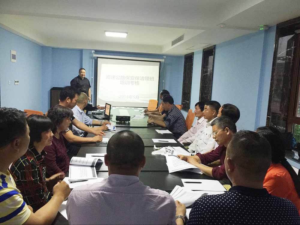 公司培训部李老师对保洁保安领班人员授课,一起学习《全国高速服务区服务质量等级评定细则》内容