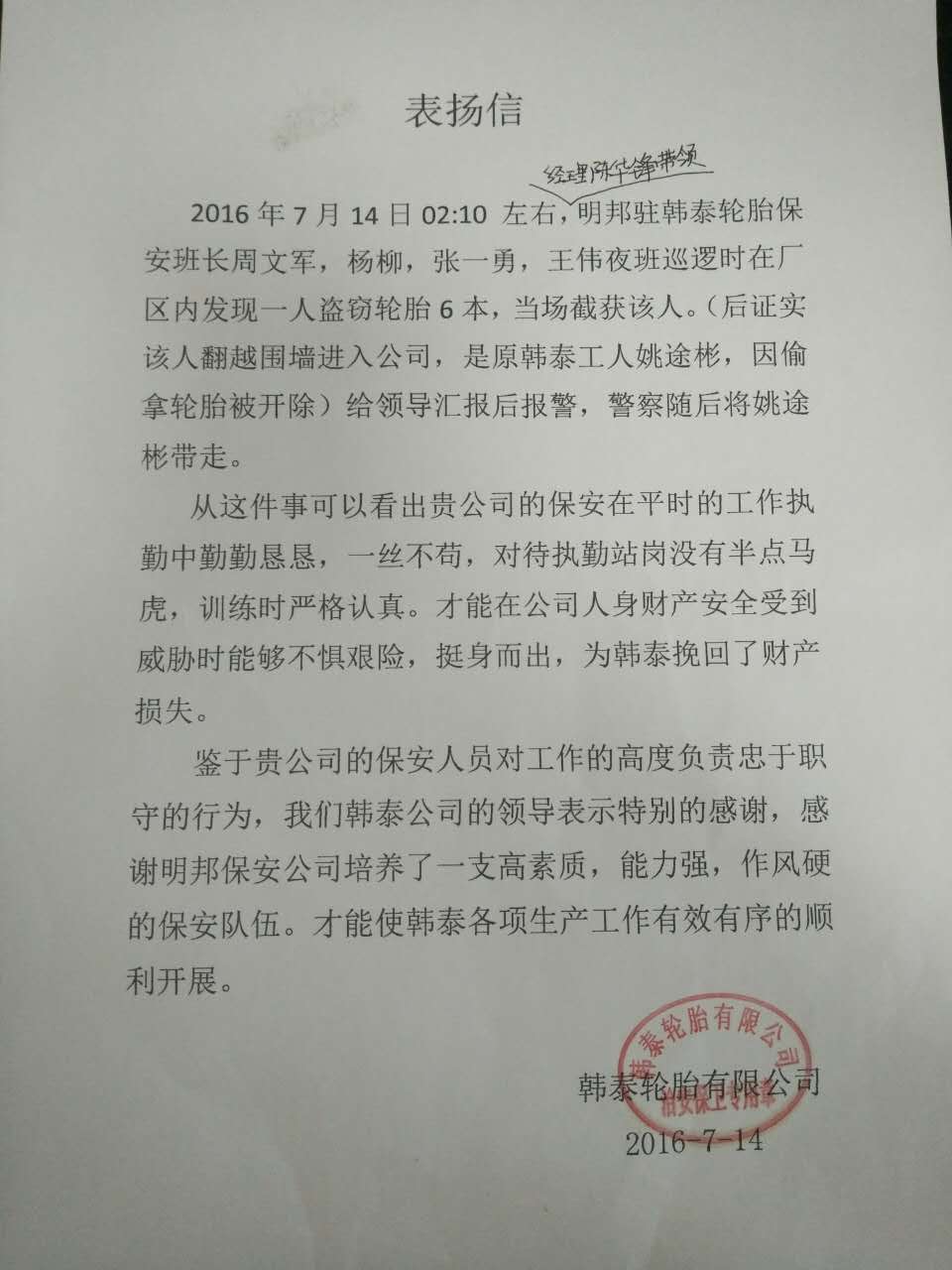 2016年7月14日,明邦驻嘉兴韩泰轮胎保安班长周文军等人在夜班巡逻时,发现一人在鬼鬼祟祟的东张西望,动作十分