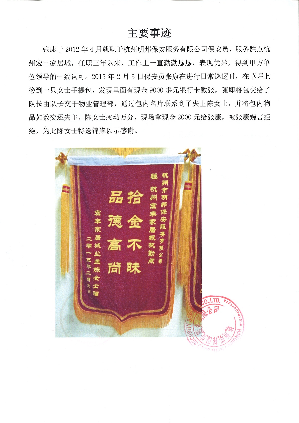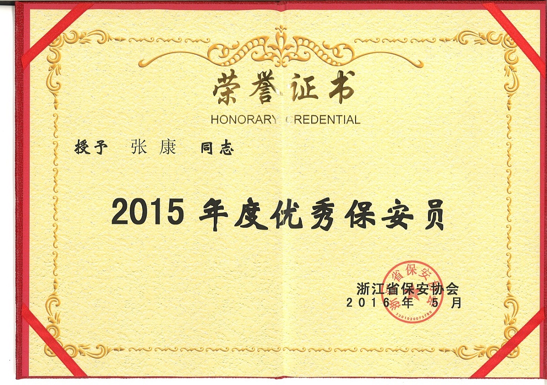 祝贺我司保安员获“2015年度优秀保安员”称号